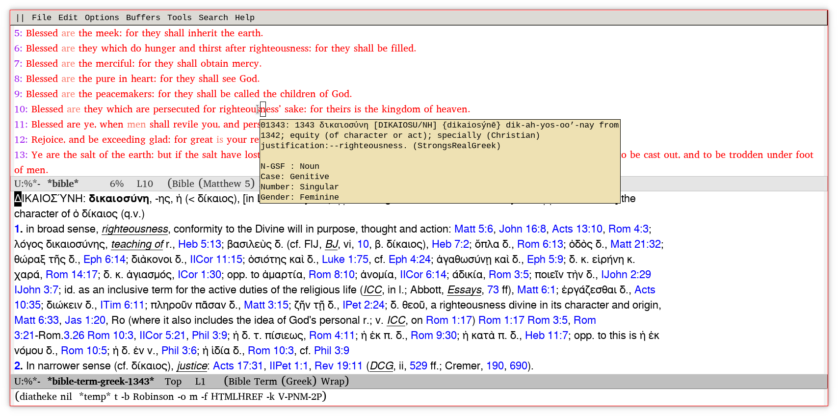 An Emacs Bible study application using the SWORD project's `diatheke' command line program to access SWORD text modules.