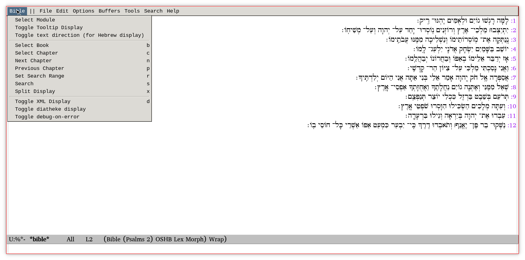 An Emacs Bible study application using the SWORD project's `diatheke' command line program to access SWORD text modules.